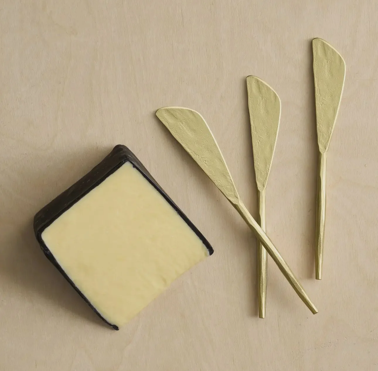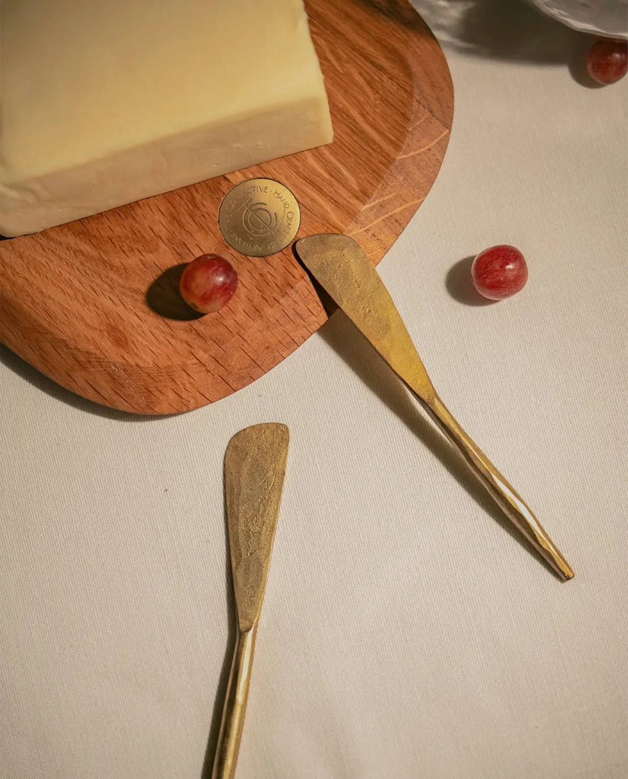 A small blunt-edged knife in a hammered brass finish is just what's needed to gently cover bread or crackers with butter, soft cheese, dips or jam. Handcrafted from Stainless Steel.