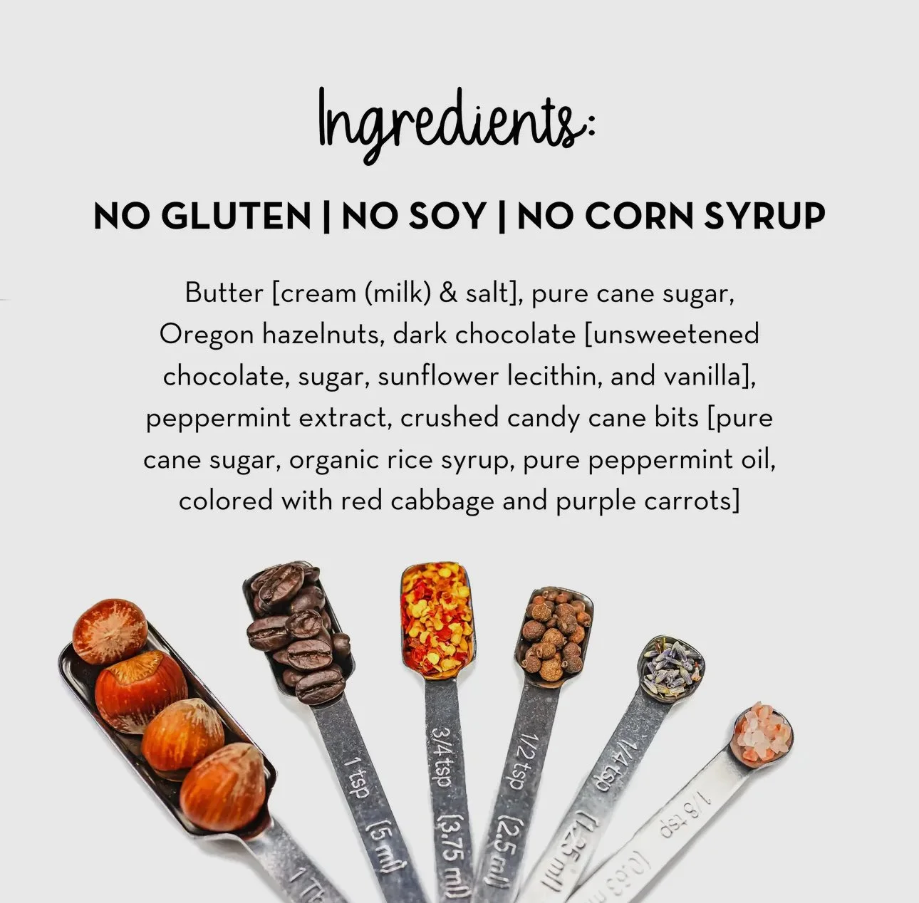 Our toffees contain no gluten, no soy, no corn syrup and no preservatives. It's Happiness. Plain & Simple!